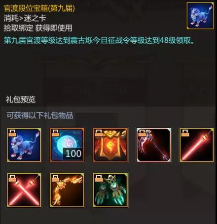 征战令等级达到48级且战力达到15000或官渡等级达到震古烁今五阶则可分别获得无双战力宝箱(第九届)和官渡段位宝箱(第九届)。