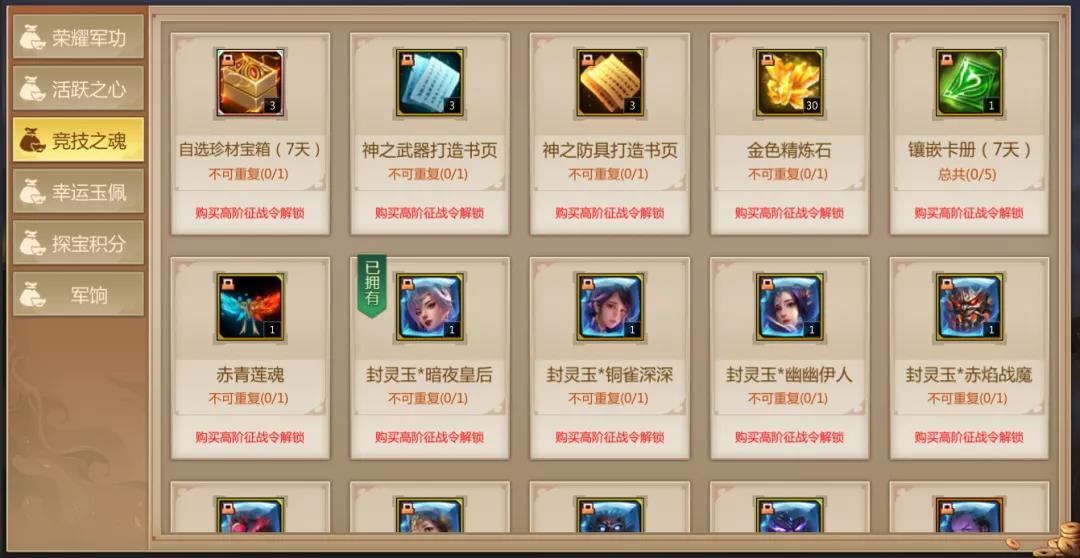 征战令等级达到32级且战力达到12000或官渡等级达到名扬天下五阶则可分别获得50个竞技之魂。