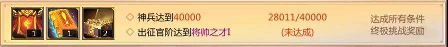 同时,神兵值达到4w且出征官阶达到将帅之才Ⅰ,并完成所有出征挑战即可获得终极奖励。