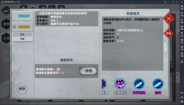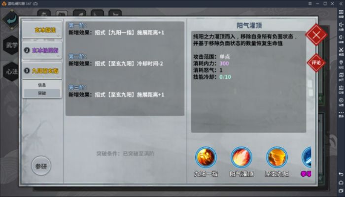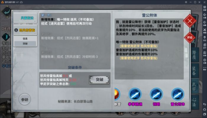 武学除了先天紫级(就是墨子悲丝和圆明寂照)外,外功可以通过祈福获得真解然后突破,零级突破只是活动新的武学,之后可以进行三次突破,每次突破都可以获得新的增益,和三次人物突破合称三突三破。