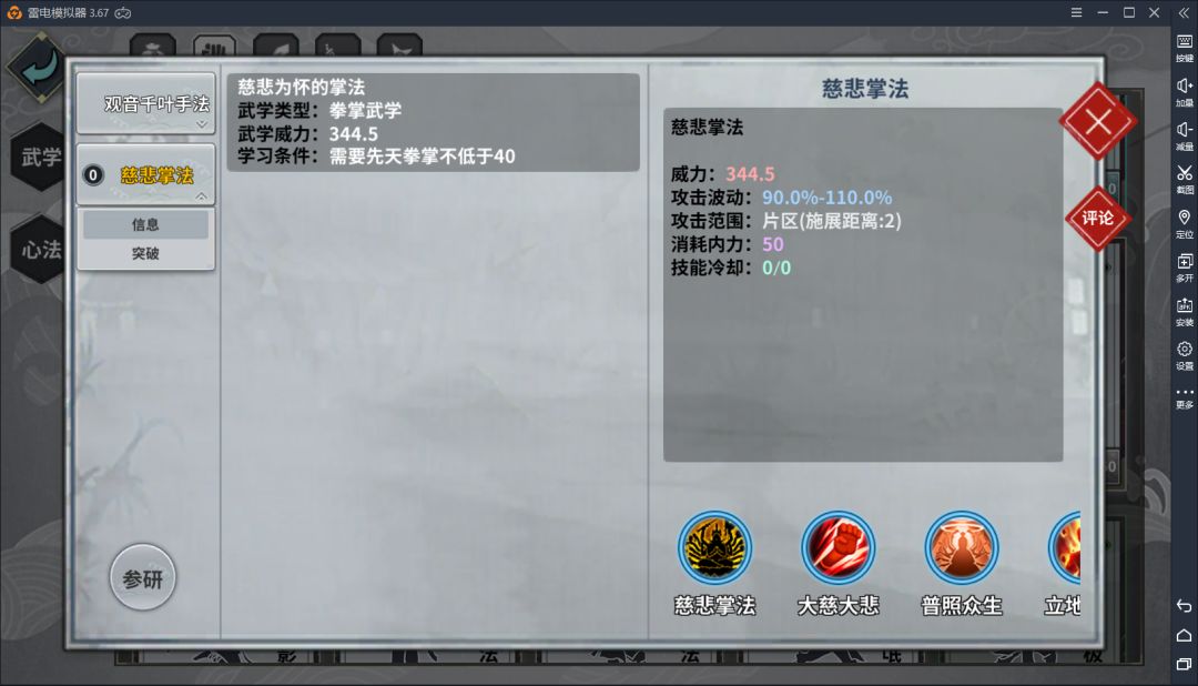 慈悲掌法,观音千叶手的进阶,不推荐主,威力344.5,倒二档,是为数不多的几门回复武学(就是直接加血,而非加盾),定位辅助。