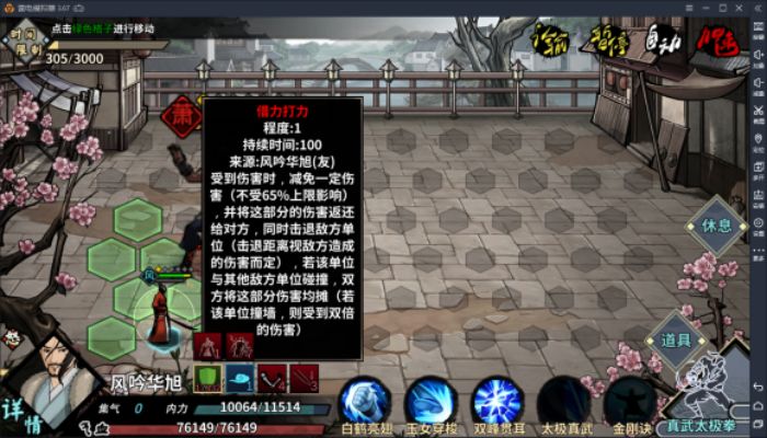 三技能,附带普照,也就是我所说的为数不多的几个加血的技能,是回复福缘X6的血量,持续三回合,普照是只要行动一次就恢复一次血量,福缘到顶也就200来,满集气就是3次恢复,也就是1800的血量,这个血量不多也不少,差不多是输出位的一次攻击的量,但是得满集气,在用这个武学的范围内(周身两格),才能做到,这就感觉有些鸡肋了。普通的加盾技能可以获得桃华等的提升,但是这个加血的不行……