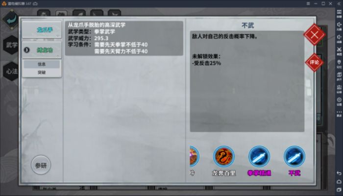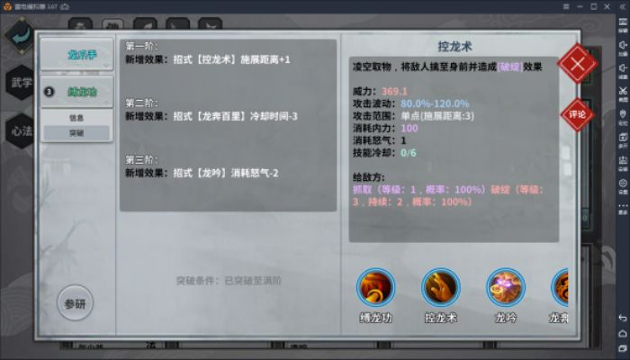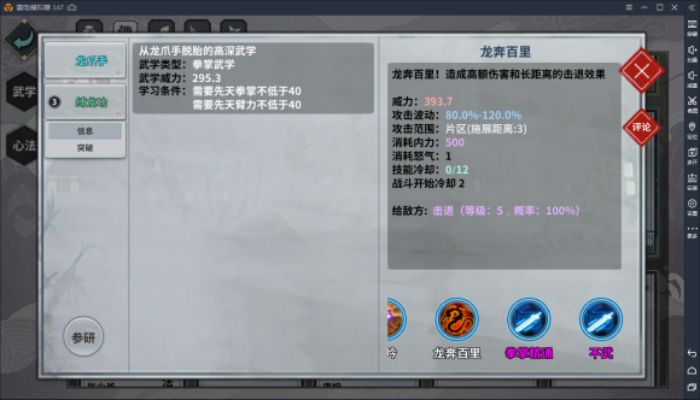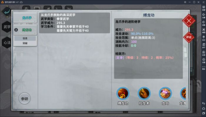 缚龙功,龙爪手进阶,威力295.3,负一档武学,没见过那个突破武学比这个威力更低的了——吃我辛辣天赛了