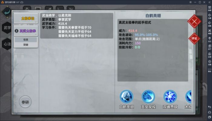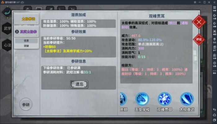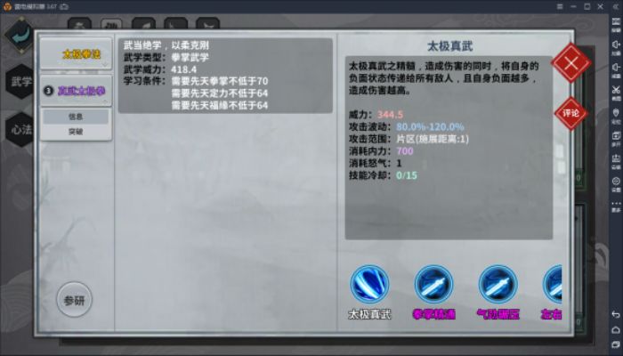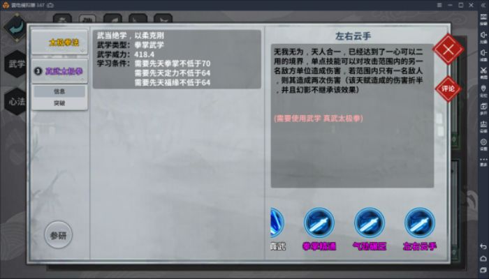 之前被砍过一刀,威力从超一流砍到了一档(418.4),但依然很强,强到进阶武学不如原武学的威力强……而二技能也是很少威力比普通攻击高的技能,太极拳的确是强到影响平衡,是一个有肉有伤害的武学。太极拳强,除了三突后的借力打力还有云手,这里测试过程不表,结果是左右云手受暴击影响,且和主(普通)攻击联动,也就是说左右云手也是可以打暴击的,对于左右云手的描述我觉得更确切一点的是,再以第一击伤害一半为基础再攻击一次。至于攻击特效的触发情况,这里测试结果是破风的击退云手的可以触发的,如此推测,部分的特效也是可以通过云手触发。