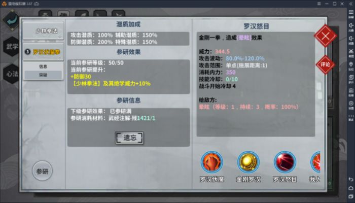 罗汉伏魔拳,少林拳的进阶,简称罗汉拳,防御型数一数二的武学,它是唯一一个秘籍武学中带挡刀的武学。——罗汉怒目