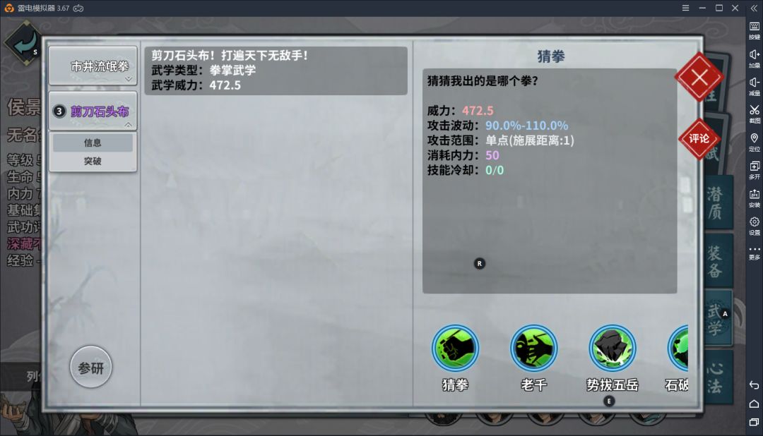 很明显能够看出前身是野球拳(野球拳天下第一!!!),沿袭了金庸群侠传中眩晕,极少数的片区形眩晕,相较于野球拳的天下第一攻击力,石头剪刀布更倾向于辅助武学,绝对的顶级辅助武学,甚至可以问鼎第一辅助武学。(也可以打输出,但是输出强的比这个要多 ,这里仅仅以辅助+输出的观点分析)