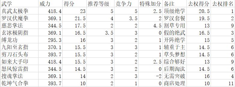 最后拳系的汇总统计,太极拳名至实归的第一,罗汉拳紧随其后,剩下的变动就大了,武学是否加权对于排名影响较大,在我看来,这份统计还算公允,加权是因为在部分情况下这门武学可以发挥极大的优势,或者是其他原因(备注有写),如果去除加权的话,我也做了排名及其分数统计,好了拳系结束,我是风华,我们下期再见