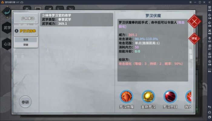一技能,罗汉伏魔,攻击有一半的几率附带攻击弱化,但是武学的攻击范围实在是小,是周身一格点攻击,虽然附带的效果不错,但是很难打到人,不过我们也没要求一个防御角色去大人。