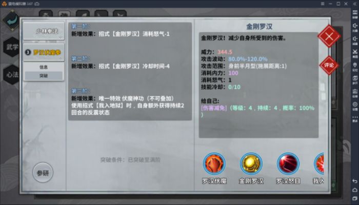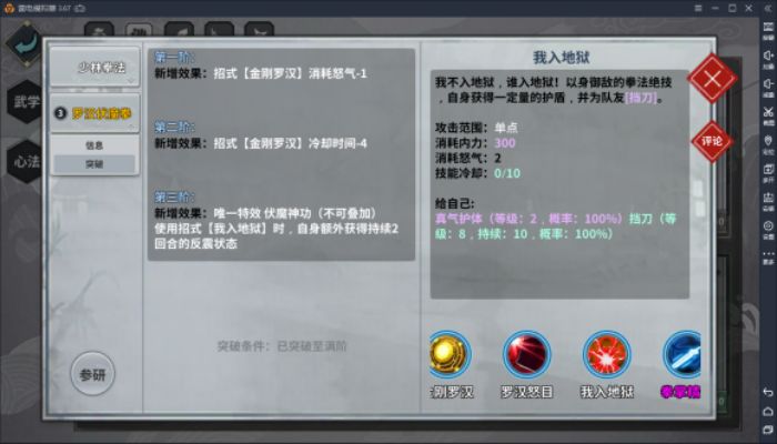 四技能,我入地狱,获得挡刀和真气流转,武学三突后附带2回合的反震,技能冷却是10,挡刀等级也是10,这里需要说明一下,挡刀10的意思是提供十次挡刀,而不是持续10回合的挡刀,这个技能没什么好说的,就是防御的核心,能够自己确认释放技能获得挡刀的实在是太少了,玄武劲虽然可以提供高额的防御,但是没有挡刀,这就让它的挡刀、援护只能通过心决和装备,这实在是有很大的不确定性,而罗汉拳就可以规避这个风险。