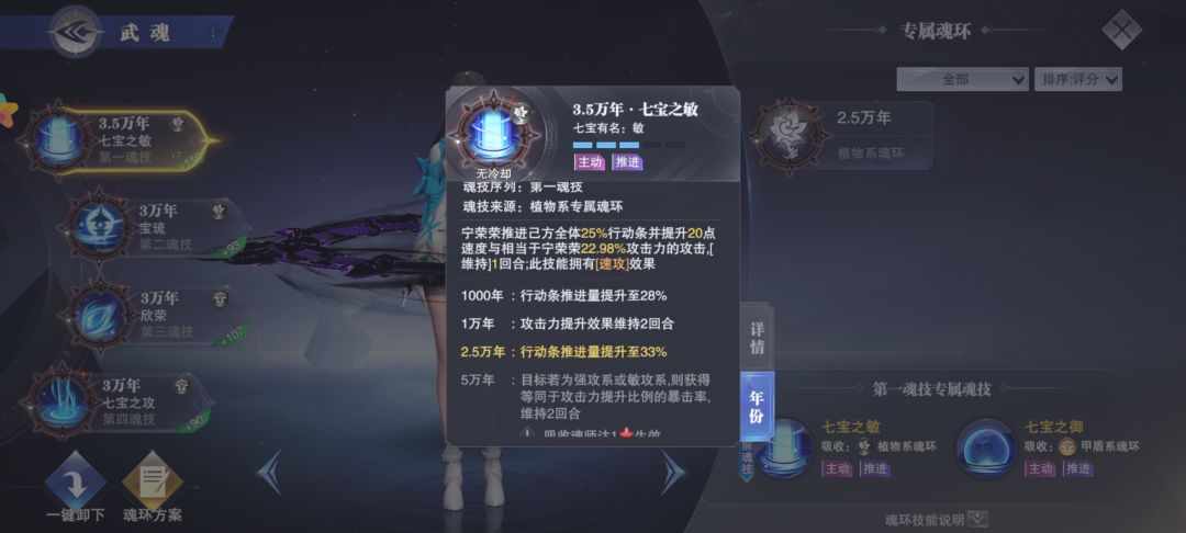 第四魂技重点又来了,首先七宝之护,免疫低于一定自身生命百分比的伤害,随魂环年份提升,同时增加暴击抗性,并且如果自身生命值在百分之30以上自身不会立刻死亡,不用我说大家也能想到,这个魂技PVP神技,尤其在面对普攻破甲队的时候,基本不掉血。并且在巅峰演武中,比如我现在打到蓉蓉最后一关,(这两天都没咋打)。因为对面普通攻击一下基本我方魂师就要死了,就可以用这个技能来克制地方输出。另外一个魂技,七宝之攻。真正的无敌效果,使我方目标立即行动并且主动技能减少魂力消耗,同时有两回合或者四次受击的无敌效果,单核阵容尤其好用,或者在巅峰演武中给柳二龙加持此魂技,等待队友死亡来收割残局。