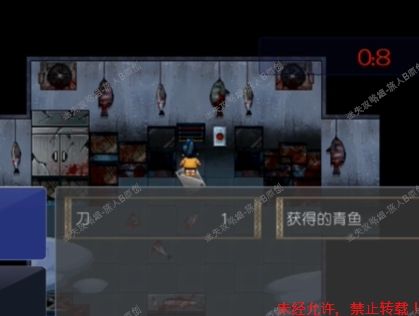 57.进入b3后首先来到的是海豹房,绕过想要吃鱼的海豹,进入杀鱼房,拿起【青鱼】和【小刀】,此时大门突然关闭,一个声音恐吓艾莉,告诉她永远也无法逃离此处。在右上角的时间结束前,若不把鱼杀完游戏结束。57.1