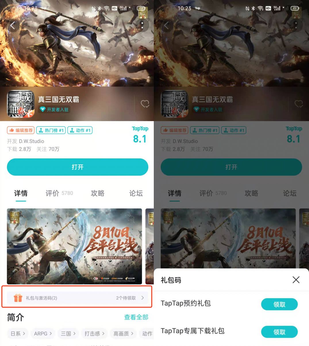 第一步:首先在 TapTap 下载《真三国无双 霸》,点击详情页,会看到「礼包与激活码」选项。