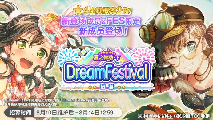 PS:8月14日「夏之律动・下 Dream Festival招募」结束后,游戏内将开启「LOVE DOOOME!招募」,本招募的新增成员将在该招募中登场,Dream Festival限定成员不会在该招募登场。
