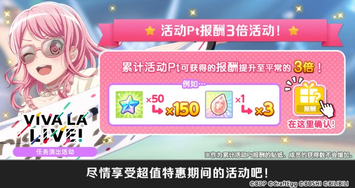 在本期的「VIVA LA LIVE!」任务演出活动中,累积活动Pt获得的报酬数量增至平时的3倍。