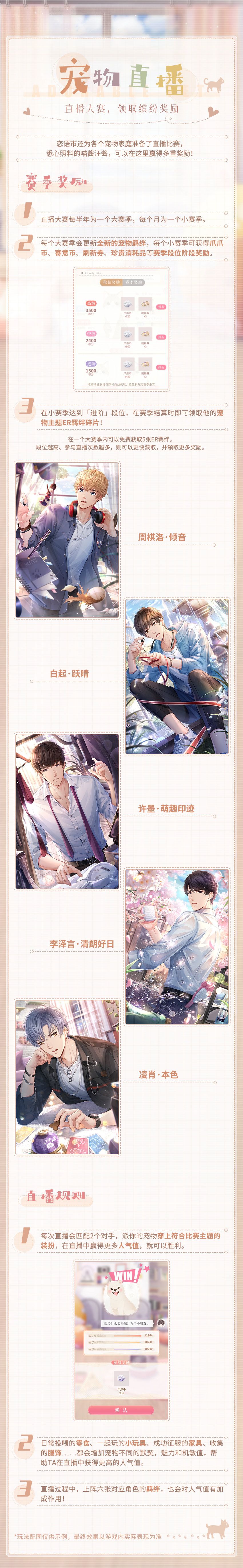 恋语市还为各个宠物家庭准备了直播比赛,悉心照料的喵酱汪酱,可以在这里赢得ER羁绊等多重奖励!