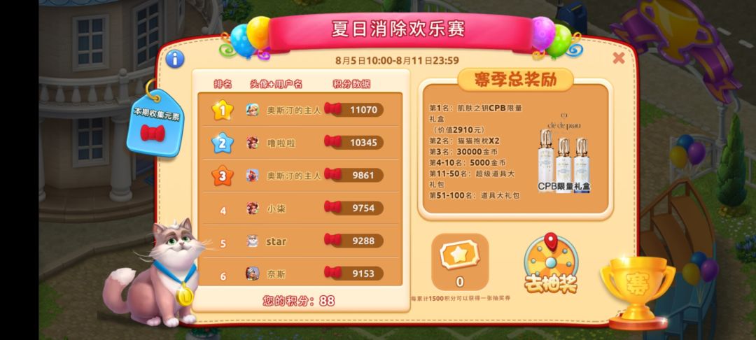 1、活动期间,成功闯过主线或冠军赛关卡收集指定物品来累计积分进行排名,每收集1个物品获得1个积分,活动结束后将展示获奖名单,排名越高奖励越丰厚。