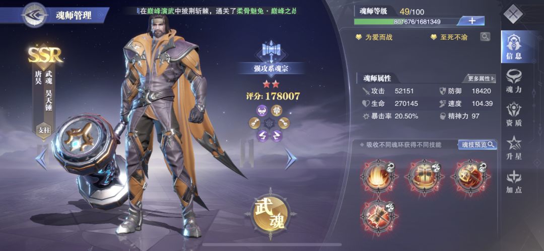 ssr中强攻系中较全面的魂师,集吸血,连击,群击,封被动于一身,是当前版本t0级别的强攻系魂师。由于4技能的高额伤害加成,以及1技能5w环后,无视增益和特殊效果使唐昊在PVE中表现同样出色。
