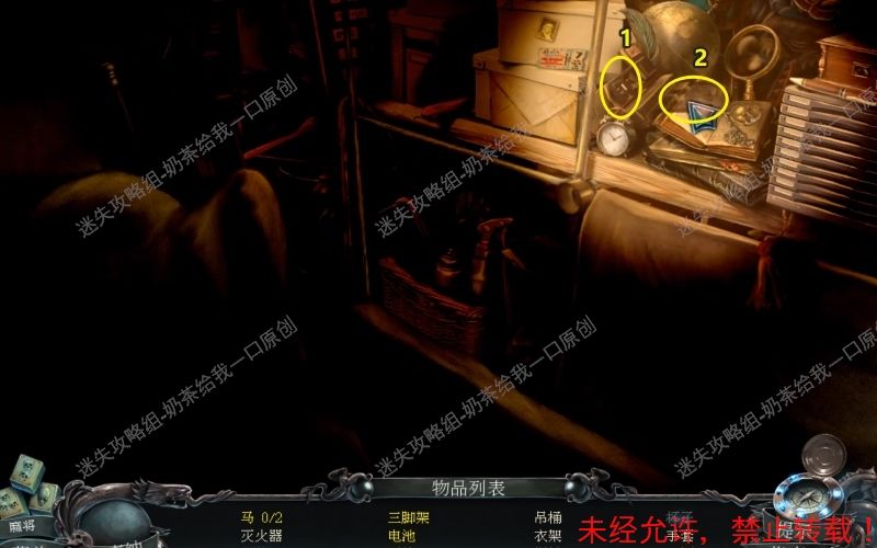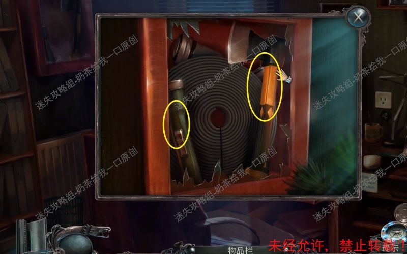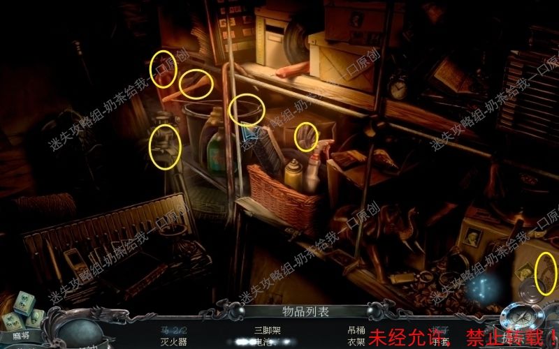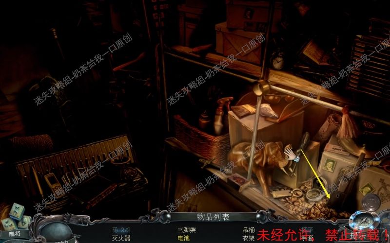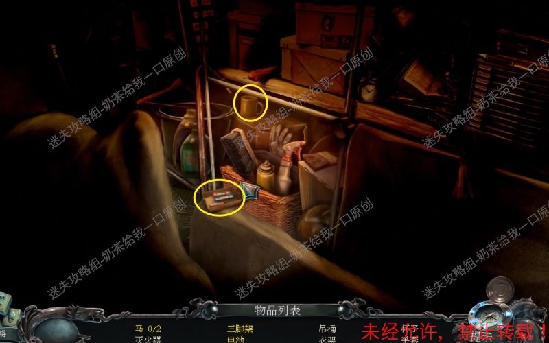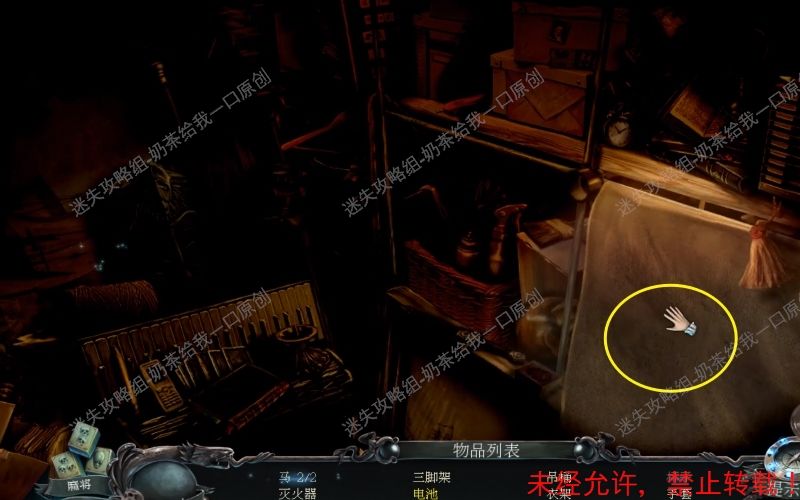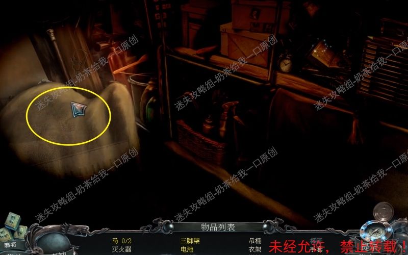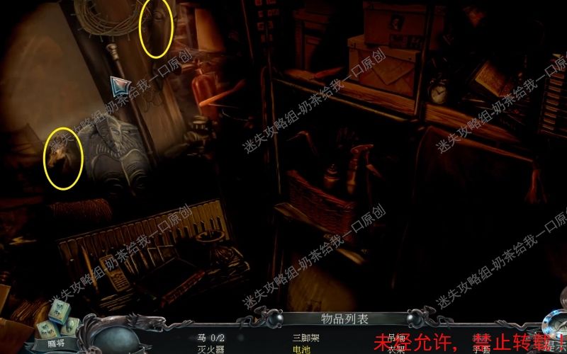 23、之后控制手电筒到此位置处,将“吊桶”“衣架”“三角架”“手套”“灭火器”“王冠”拿走。最后取走此位置的“拐杖”即可。23.1 23.2