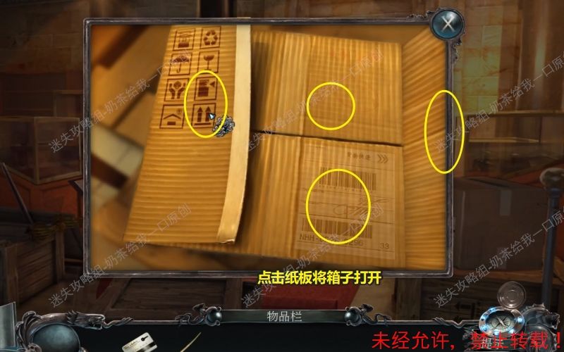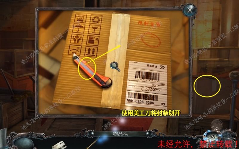 3、查看此位置的纸箱,进入特写镜头。先取走上面的美工刀随后再使用它将纸板箱的封条划开。随后点击纸板将箱子打开。3.1 3.2