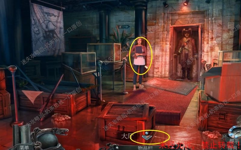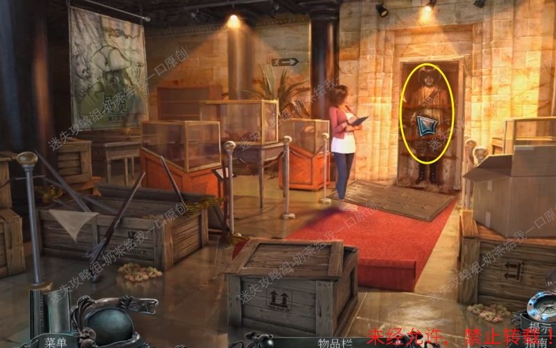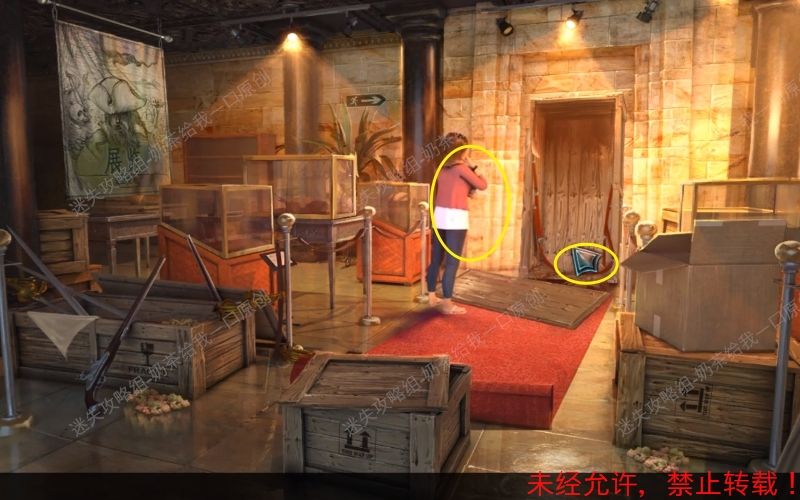 4、调查纸箱里面“潜水队”写给“博物馆馆长”的信件。之后再拿走手枪。根据箭头指示回到大厅。4.1 4.2