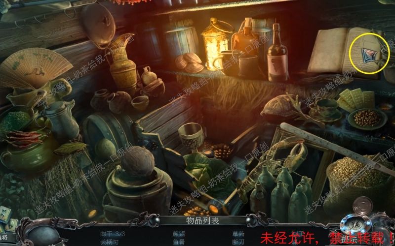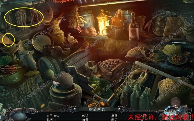 40、先将地面上的木板门打开,先不进去。调查后面的食物堆。再次进行寻物游戏,根据下面的文字提示找到对应的物品即可。先将挂在架子上面的三块肉干全部取走。接着把下面的扇子打开。40.1 40.2