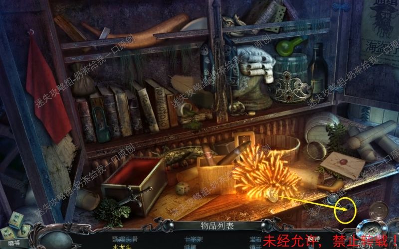 54、随后门开启,进入到“船长室”里面。点击此位置查看物品堆,继续进行寻物游戏。先将“宝石”“望远镜”“镜子”“纸牌”“鹦鹉头骨”“圆规”“锚”。54.1 54.2