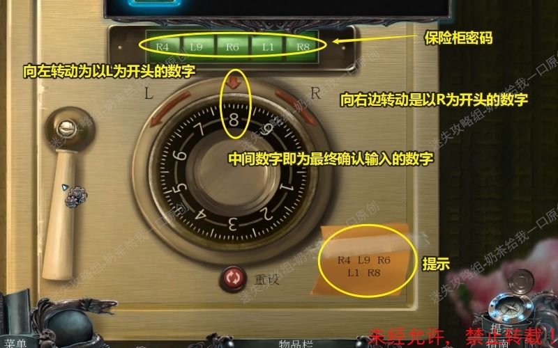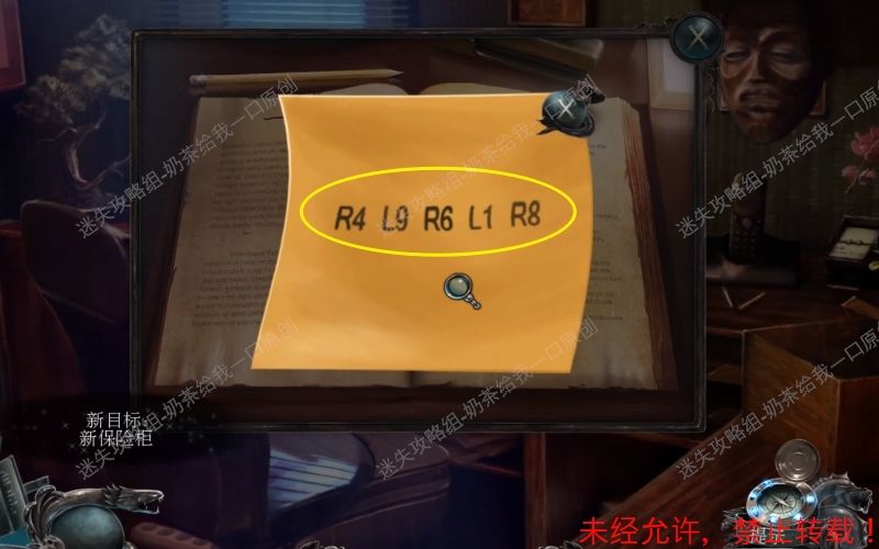 7、查看桌子上的便签,根据上面的文字提示后查看桌子书本上的纸条。如图所示记住上面的数字符号:R4,L9,R6,L1,R8,为后面的重要密码提示。7.1 7.2