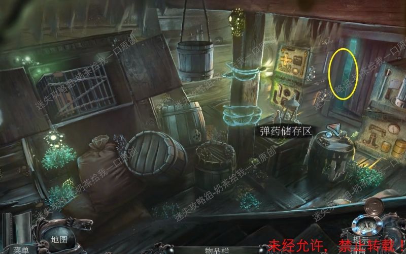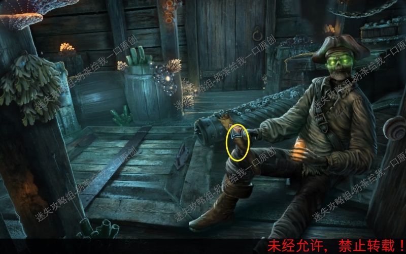 51、根据路线来到“弹药储存区”,观察船员的脚部,使用“开瓶器”将它打开。随后来到“储水舱”找到左边此位置,进入特写镜头之后,将木头点开。使用“骷髅手臂将它取走”。51.1 51.2