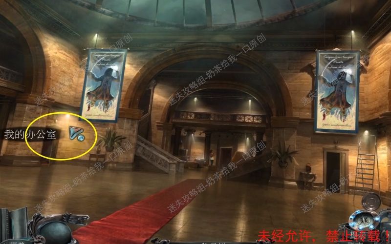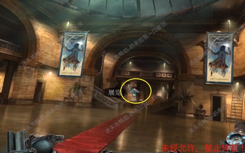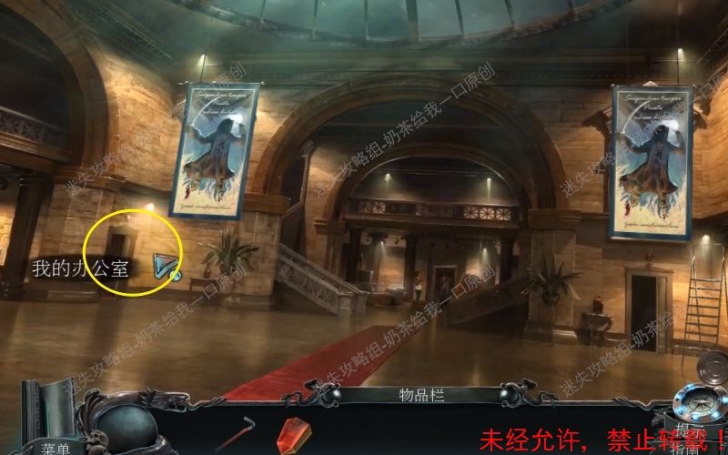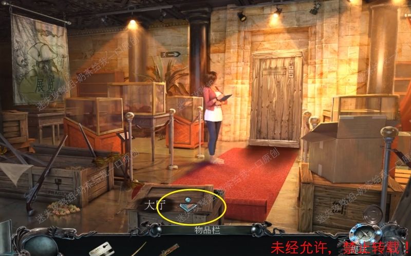 11、回到大厅,根据箭头提示前往“展览”。查看面前的木门,进入到特写镜头。11.1 11.2