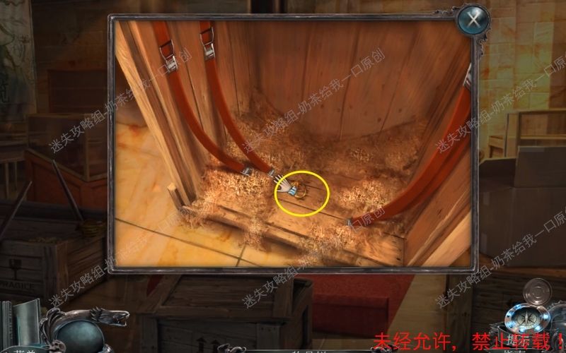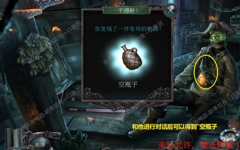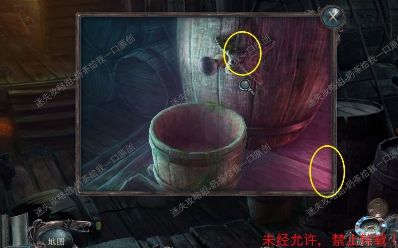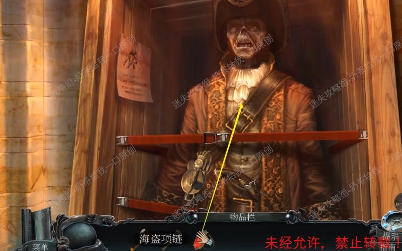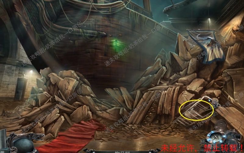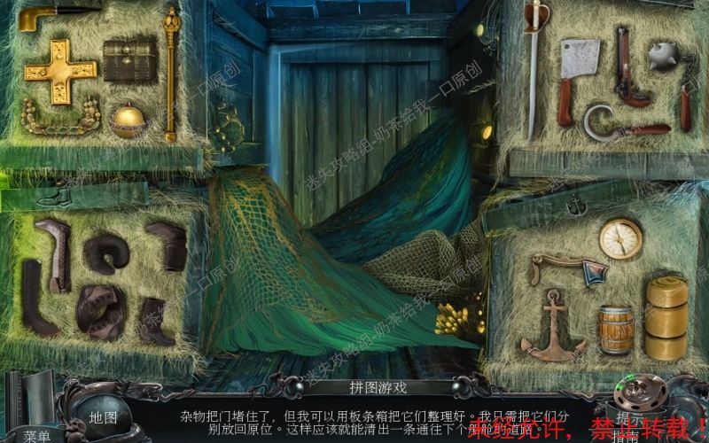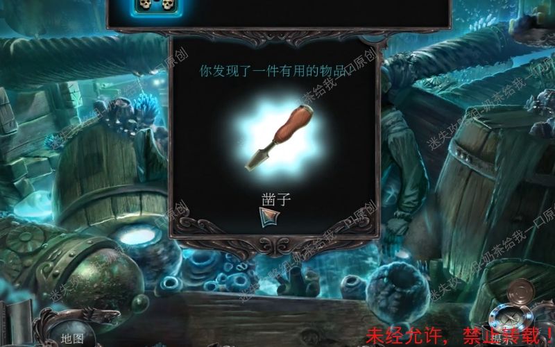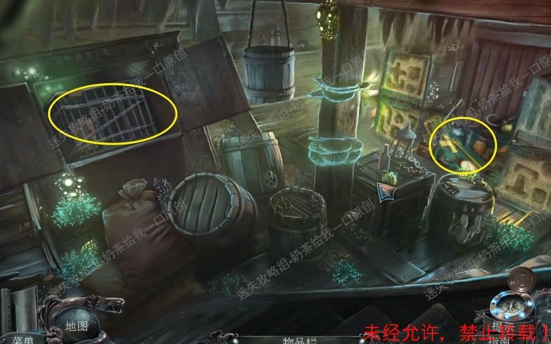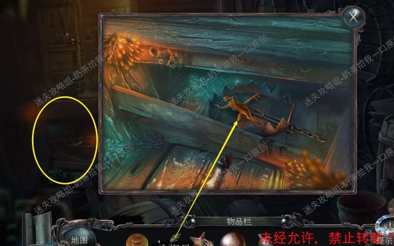 47、 点击得到“打开的挂锁”“号角”“鱿鱼”“灯笼”“浆”这些线索。 结束之后将自动得到“凿子”这个物件。47.1 47.2