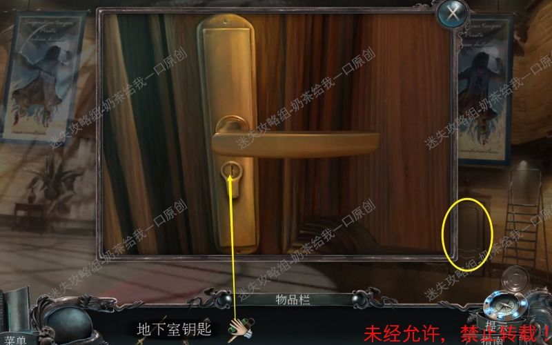 9、打开保险柜之后调查右边的信件,根据上面的线索需要找到缺失的宝石。按照之前的路线原路返回到“大厅”从物品栏里面使用地下室钥匙将门打开。(钥匙插入之后点击它一下随后再点击把手使其转动)9.1 9.2