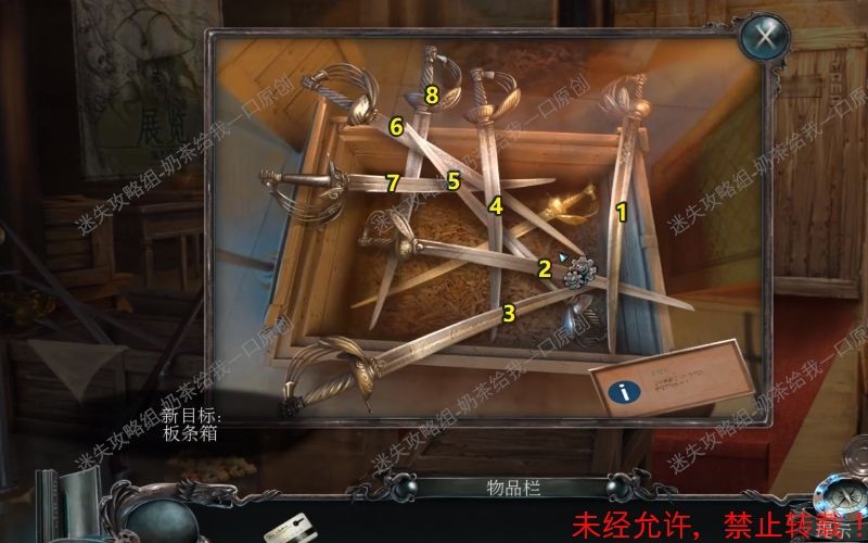 2、里面布满了剑,需要将最上面的剑依次按照图中所示数字从1到8顺序移开即可。取走放在最下面的弯刀。2.1 2.2