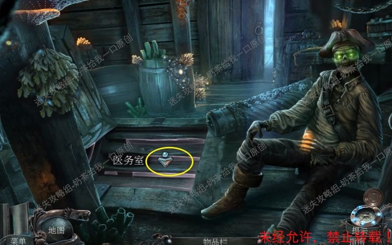 57、由于游戏结束,将会自动获取到里面的“龙头”。转移来到“医务室”调查此位置的物品堆,继续进行寻物游戏。取走“刀子”“木制假足”“剪刀”“钩子”“刨子”。57.1 57.2