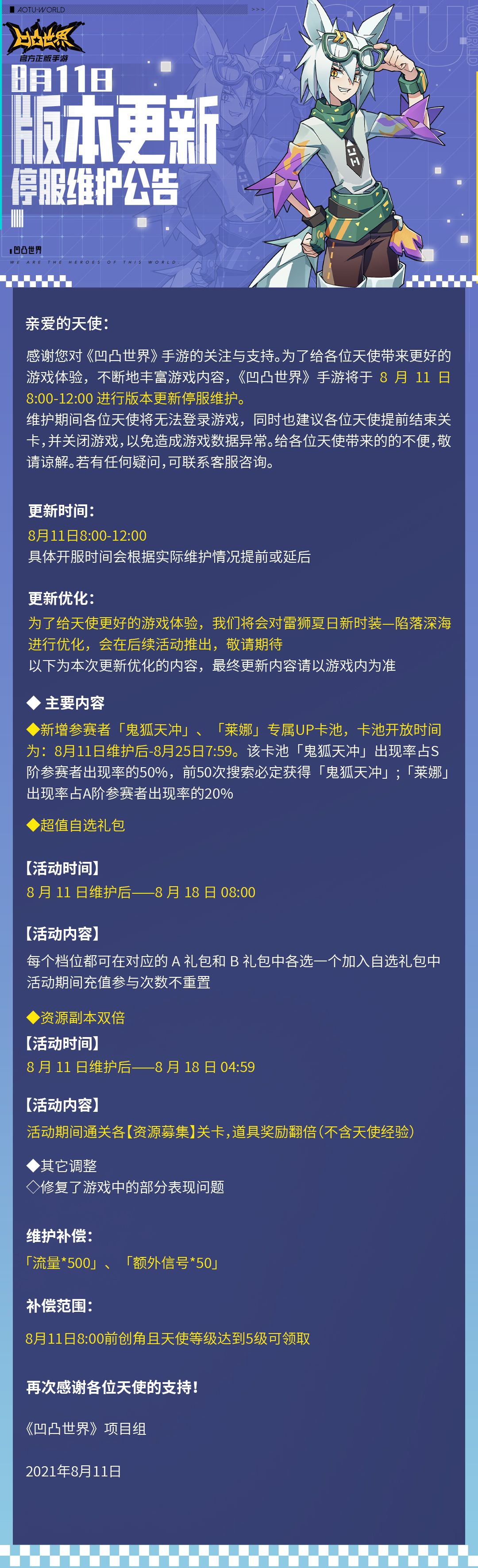 感谢您对《凹凸世界》手游的关注与支持。为了给各位天使带来更好的游戏体验,不断地丰富游戏内容,《凹凸世界》手游将于8月11日8:00-12:00进行版本更新停服维护。