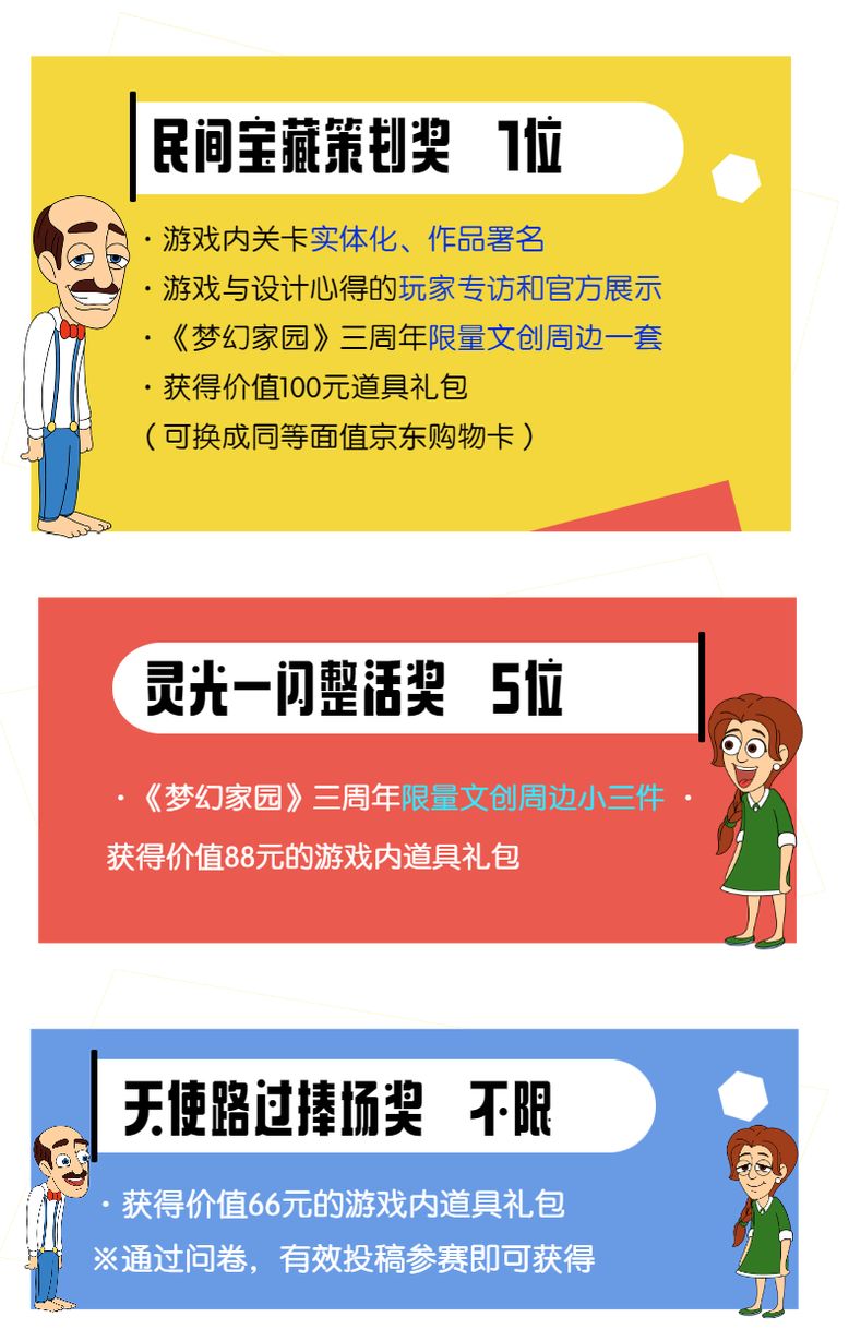 3.评选结果会于8月19日在论坛、公众号和微博公布,“策划奖”作品设计者会有专人联络进行游戏内实体化的沟通、专访和周边奖励发放,“整活奖”作品设计者同样会有专人联络安排周边奖励发放。
