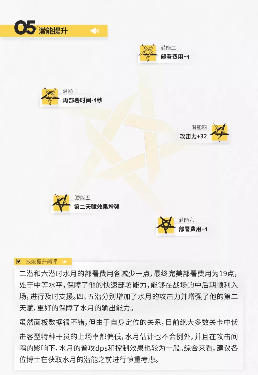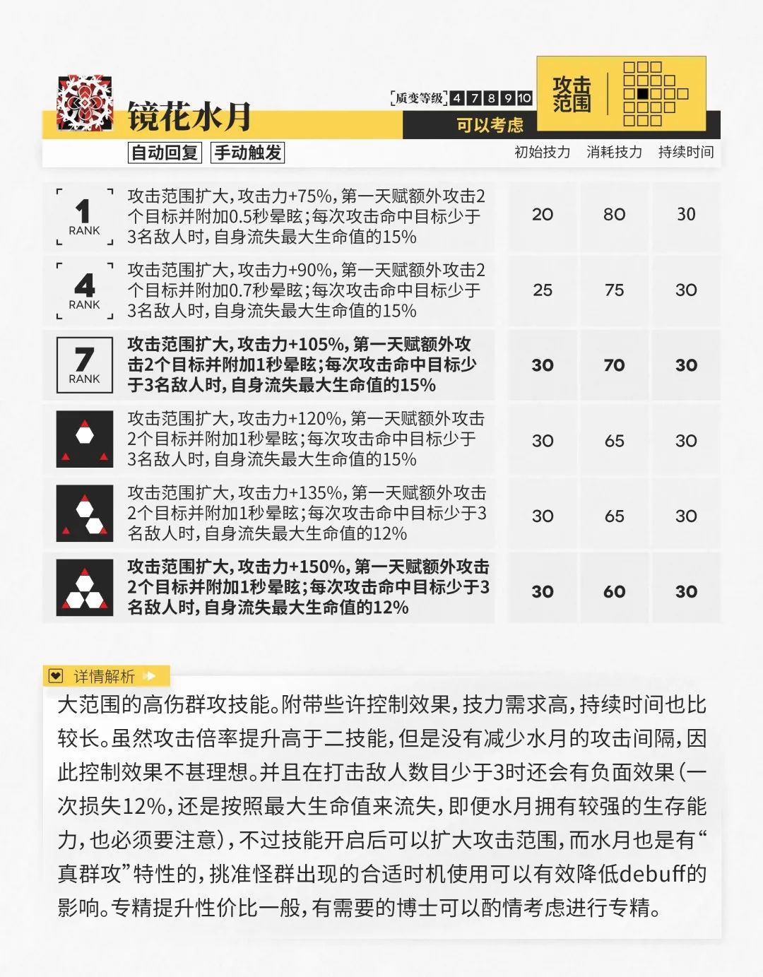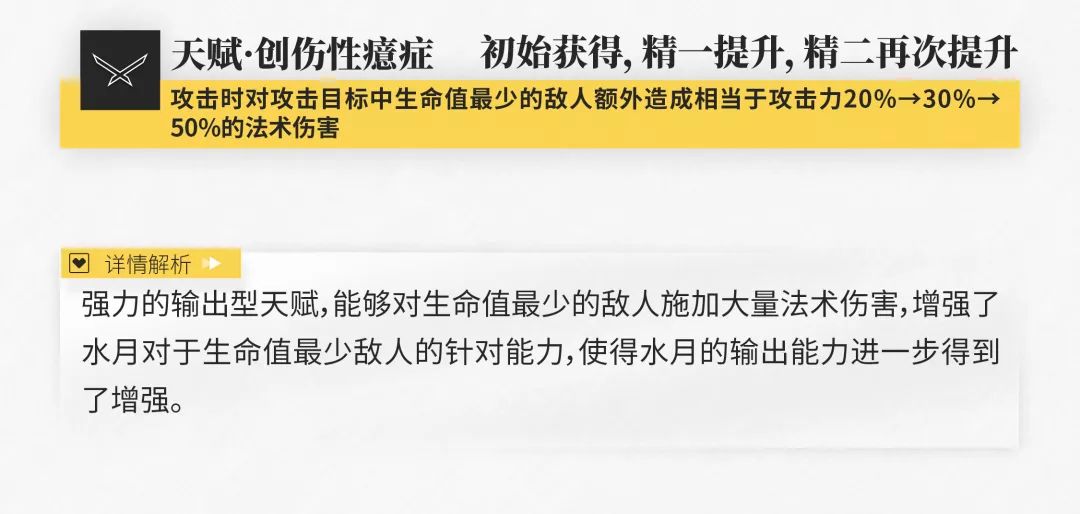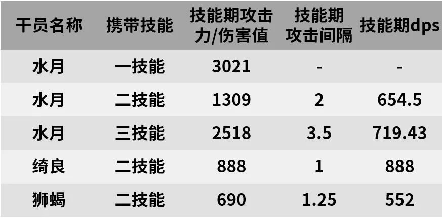 此外,水月的两个天赋也能在一定程度上提升他的输出效果,配合三个技能带来的收益是相当可观的,相关数据已在下表中列出,有需要的博士可以自行查看。