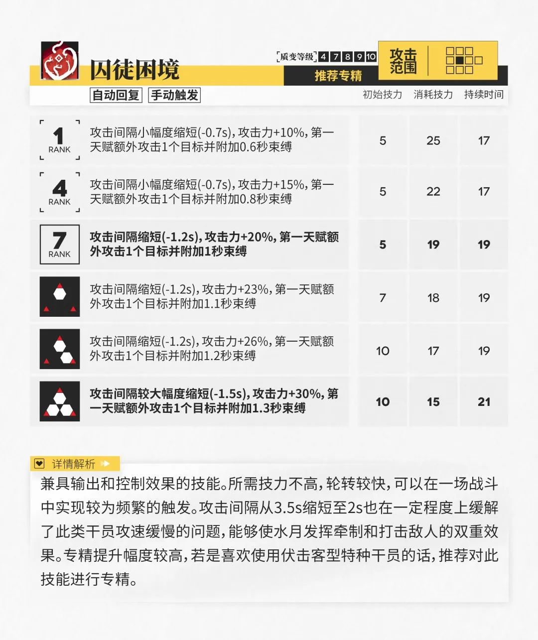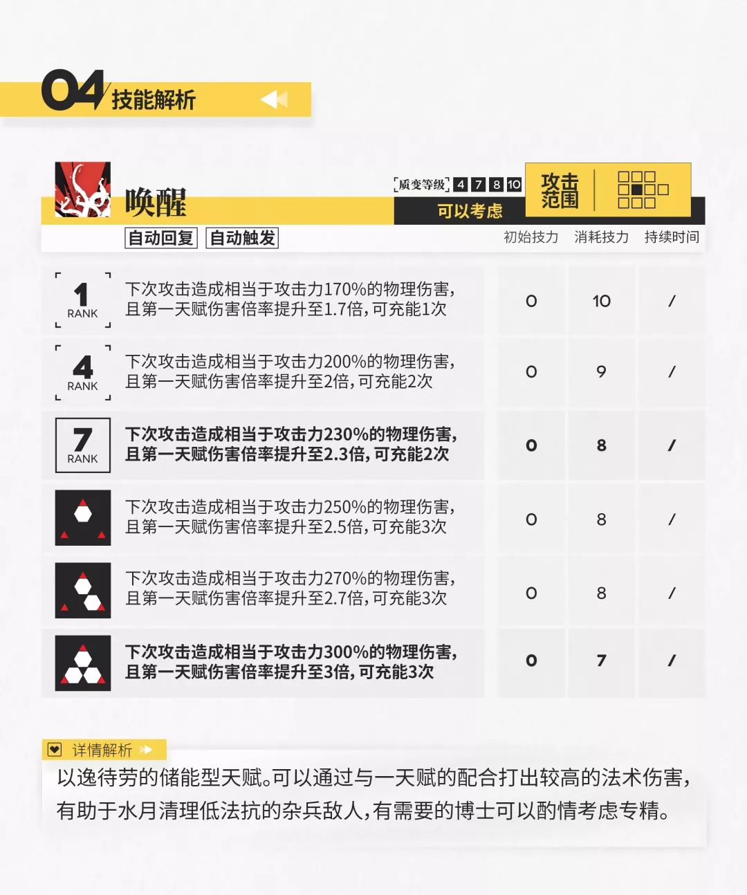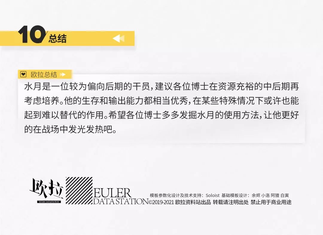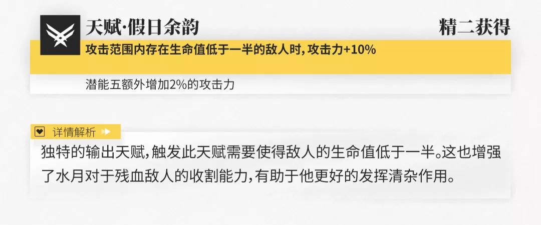 此外,水月的两个天赋也能在一定程度上提升他的输出效果,配合三个技能带来的收益是相当可观的,相关数据已在下表中列出,有需要的博士可以自行查看。