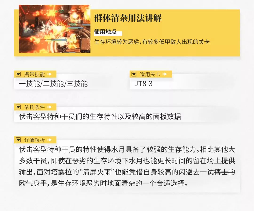 虽然伏击客型特种干员在常规战斗中上场的机会有限,但是在某些高压场合他们能起到的作用还是相当独特的。不过水月作为这一模板的六星顶点,似乎专注点从控制转移到了输出上,他的实战表现如何呢?请看下面的分析。