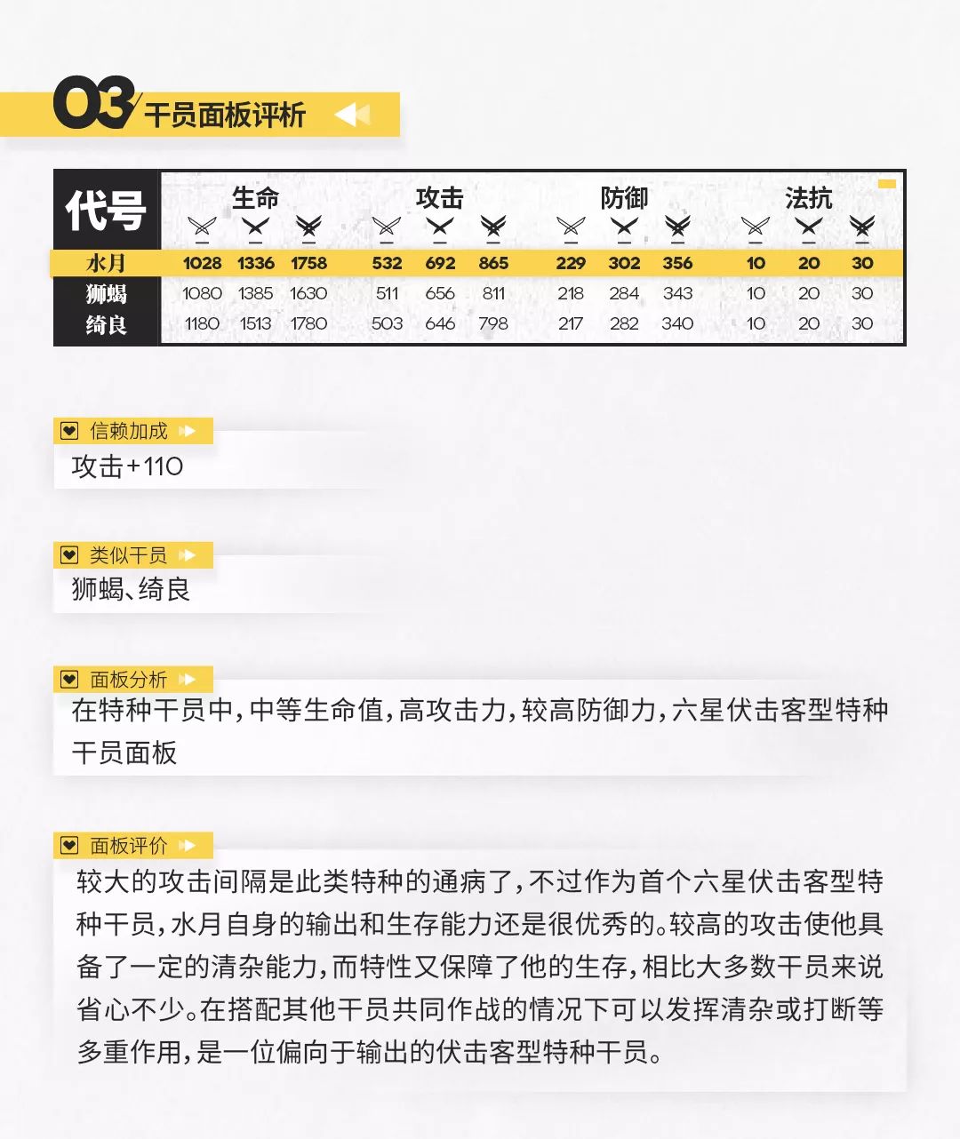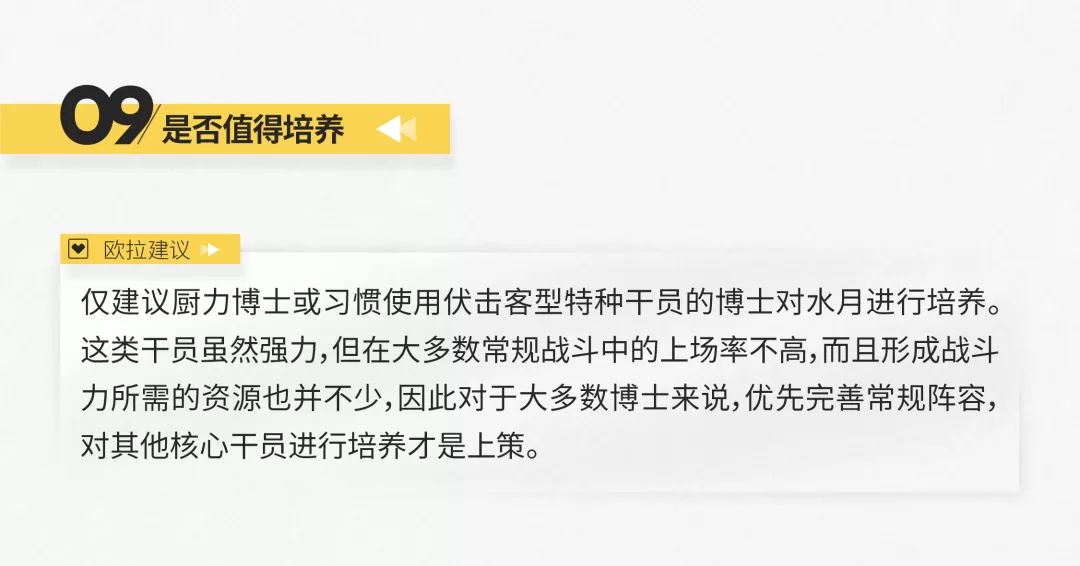 作为专注输出的伏击客型特种干员,水月的输出能力虽然受到了攻击间隔的制约,但仍然相当强大。值得注意的是,由于三技能存在负面效果,因此在攻击范围内敌人较少时携带二技能会更合适一些。二、三技能所起到的控制效果虽然不甚明显,但是作为打断棘手敌人攻击的一种手段也是相当足够了。