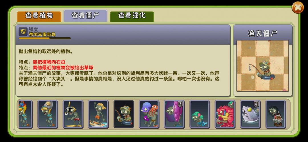 渔夫僵尸,渔夫僵尸只会出现在第9列,不会与其它渔夫僵尸重叠,会强制清除自身所在格的非无敌植物。