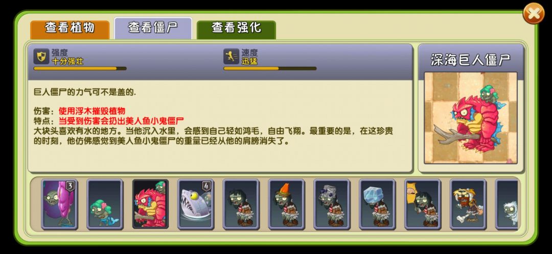 深海巨人僵尸,当其生命值低于1800(不随阶数变化)时,它将投出一个会落于场内第三列的美人鱼小鬼僵尸,已经过第3格则不会有动作。