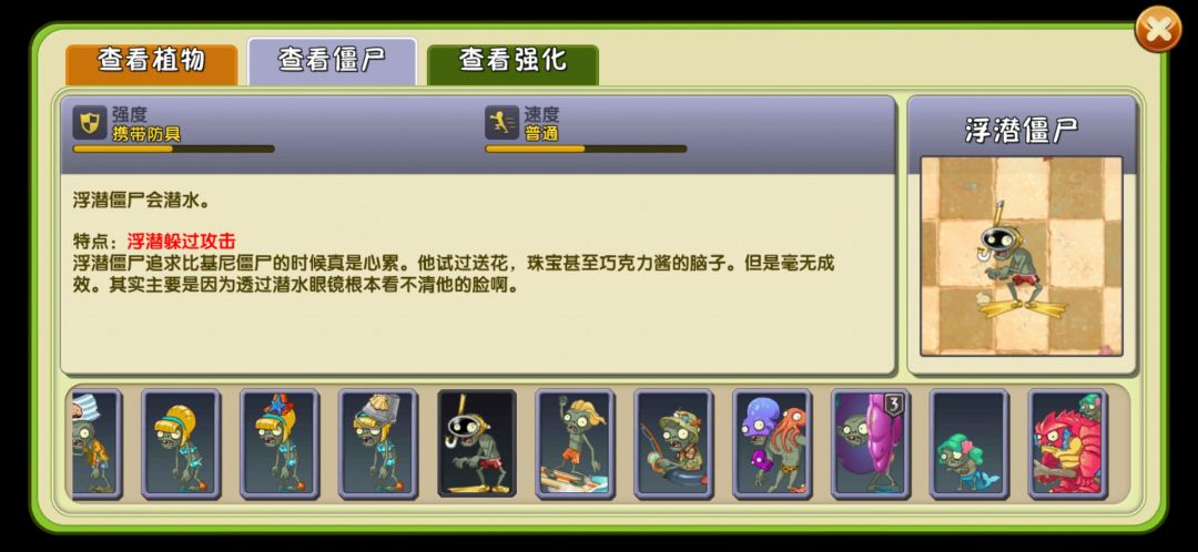 浮潜僵尸,浮潜僵尸在水中未啃食植物时会潜入海底,不会受到直射类子弹的攻击,会被投手类攻击,在水中遇到可以啃食的植物会花费约0.5秒上浮半身且可以受到攻击。浮潜僵尸在潜水期间会受到缠绕水草的攻击。会受到5阶原豌的溅射击退。