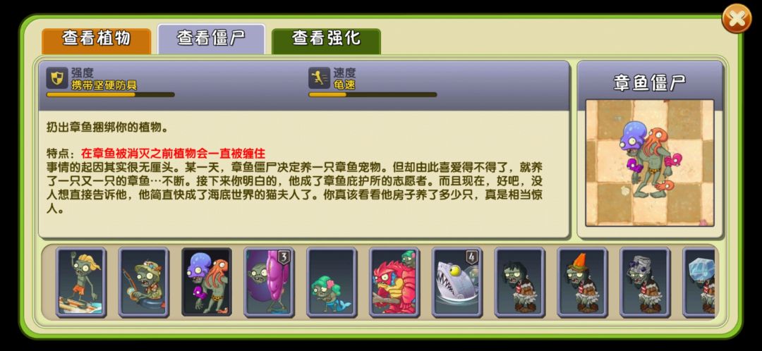 章鱼僵尸,章鱼僵尸每在场上行动一格就会投出一只章鱼,章鱼会优先锁定本行最靠右的植物。自身前场无植物时,章鱼僵尸将不会投掷章鱼。章鱼在接触到植物后会包裹它,并