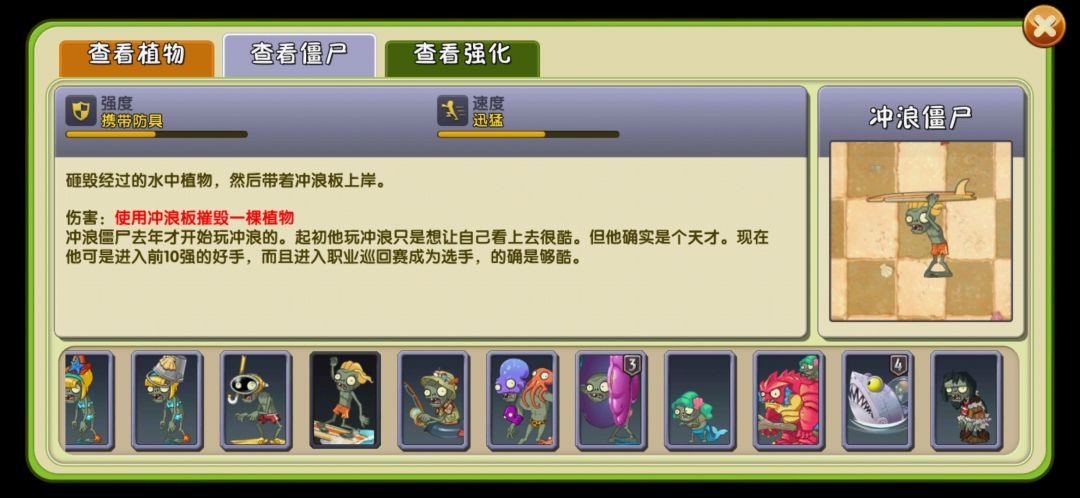 冲浪僵尸,冲浪僵尸在冲浪期间无视海上植物,落地后举起冲浪板,可以抵挡投掷伤害,遇到第一个非低矮植物后插下冲浪板形成随碍物(冲浪板的阶数跟随着冲浪僵尸的阶数而变化),冲浪僵尸在陆地上死后,若冲浪板仍在它的手中,那么冲浪板也会掉落形成一个障碍物。如果冲浪僵尸左右有植物,板子会优先落在有植物的地方。5阶大嘴的大嘴倾盆可以吞掉冲浪板。注:2阶荚兰的空气 炮不能击飞,只是击退而已。