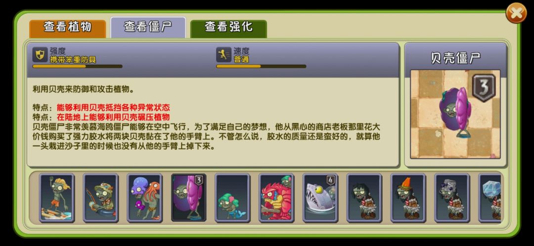 贝壳僵尸,在无尽中只会被boss召唤才会出现。贝壳僵尸可以用贝壳对植物造成高伤碾压。当它仍持有贝壳时,它可以免疫冰减速状态与冰冻状态,与法老僵尸类似,贝壳也不会被灰烬植物无视。