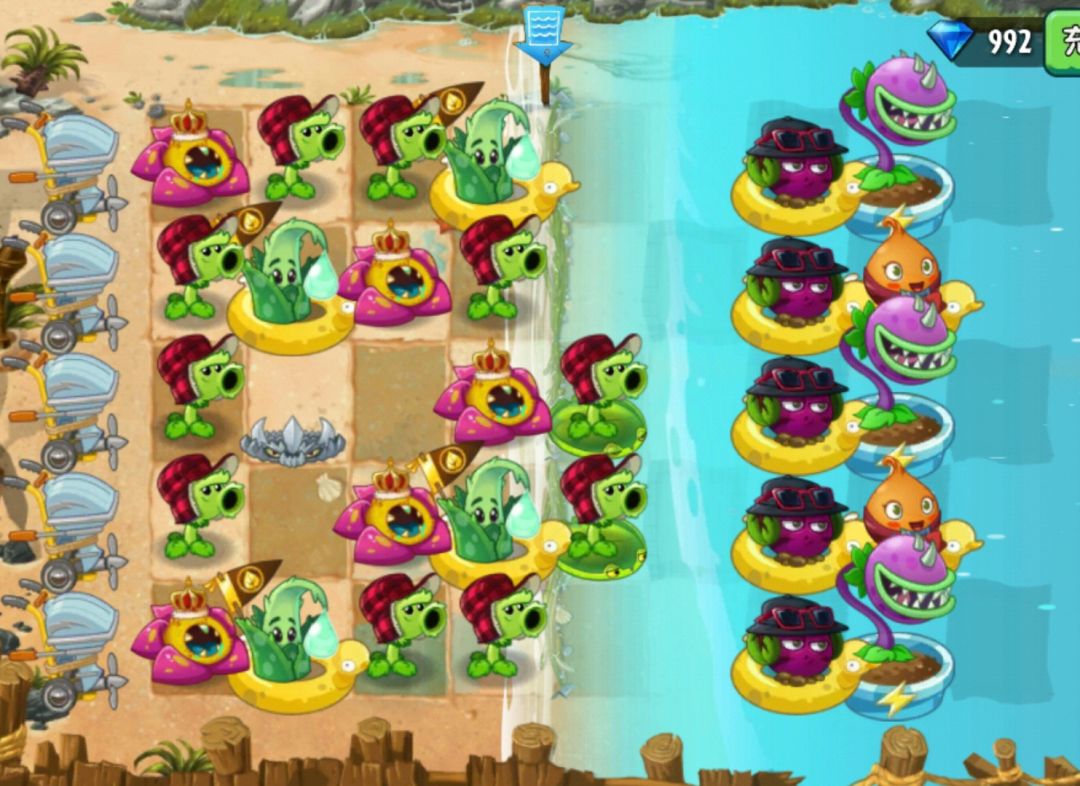 类似于聚控(祝庆的阵改了一下),原花1,芦荟3,大嘴5,魔音4,原豌5,甜薯1,普关2,4聚好再9列中路下甜薯刺开大岸上魔甘。魔音s章鱼用的,boss关铲水上的原豌种在岸上的魔甘位,如果boss要吸植物原豌开大打断。
