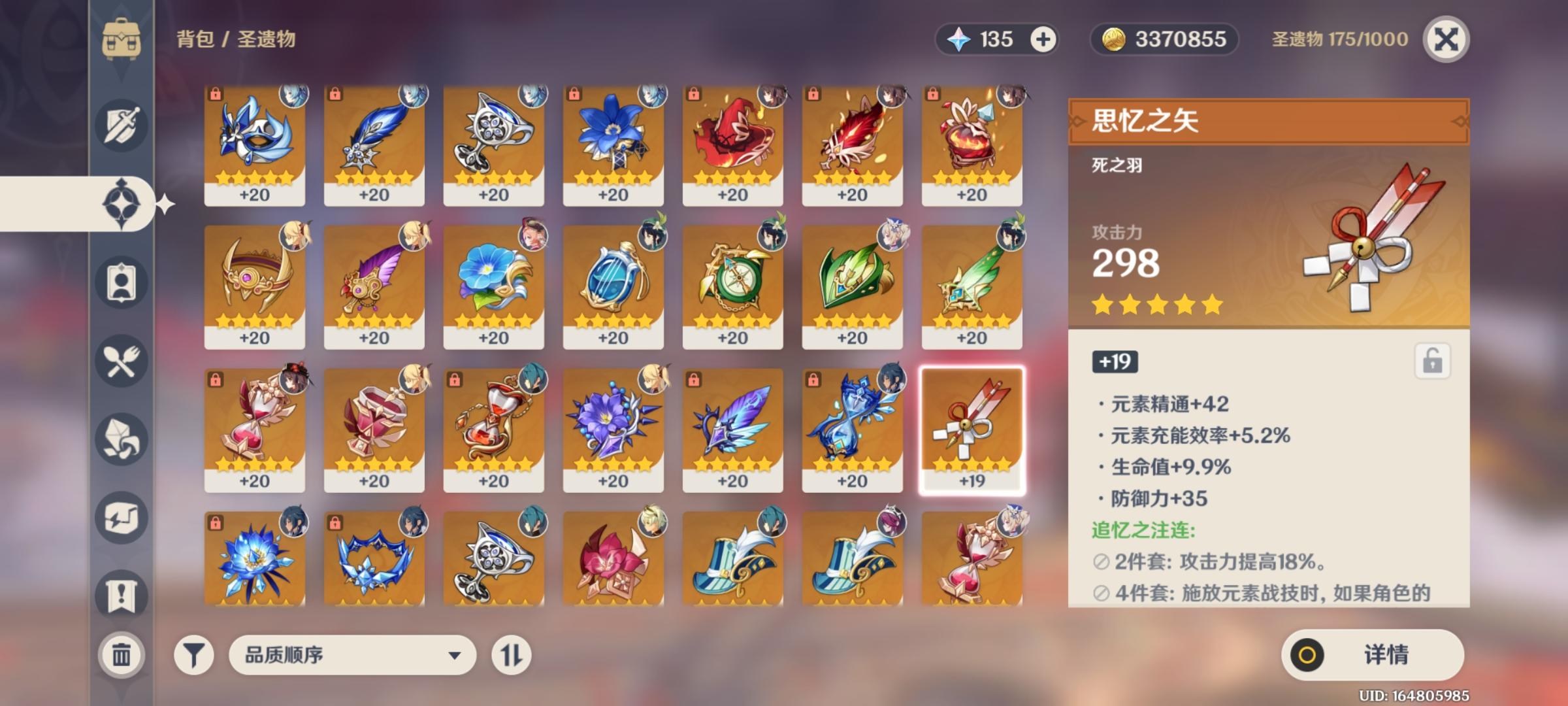 我激动坏了,连忙打开背包,火急火燎也没仔细看,抓起一个角标有“新”的追忆圣遗物就可劲升级,升到19级才感觉不对劲,我火伤杯呢?连忙退出来看了看圣遗物列表,靠,我给喂了。。。。