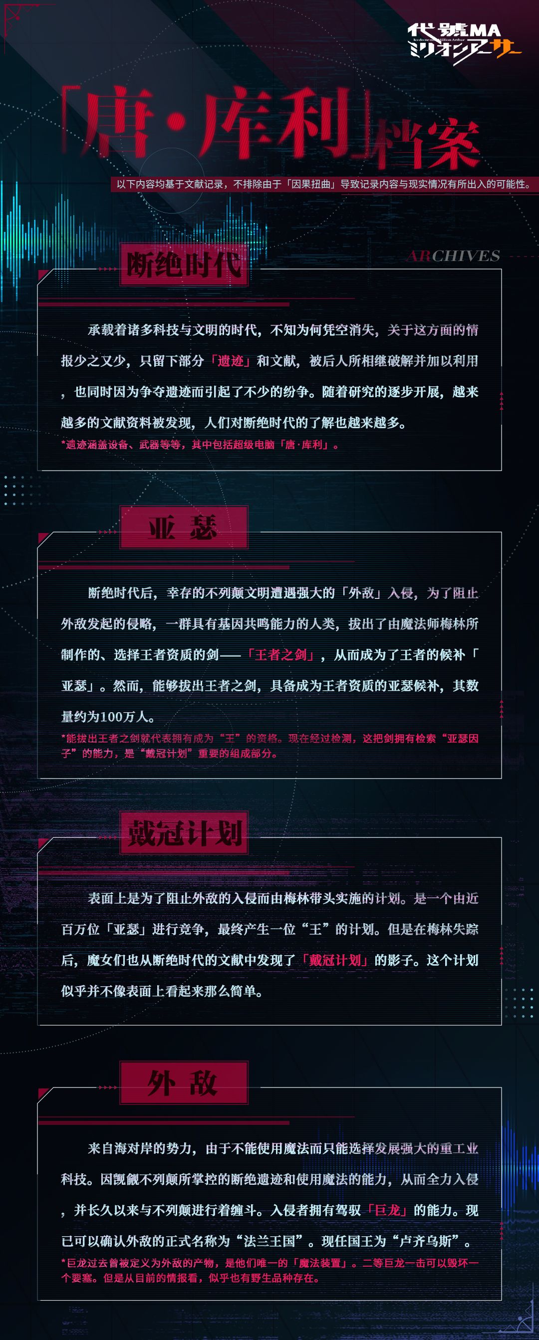 「唐·库利」是断绝时代遗留下来的超级计算机,可以自动进行复杂运算,是解析古文书的必备机器。经过破译与解析,有关于这个世界的各种词条,将被收录于<唐·库利档案>,并在此悉数展开。