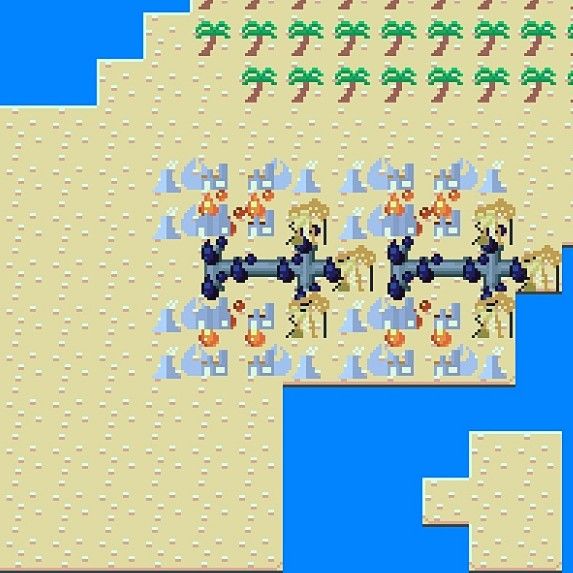 最左边中间是三个原油井,原油通过三节管道送到2个炼油厂,炼油厂与原油井之间是重油裂解厂,炼油厂和重油裂解厂向外是2个轻油裂解厂。