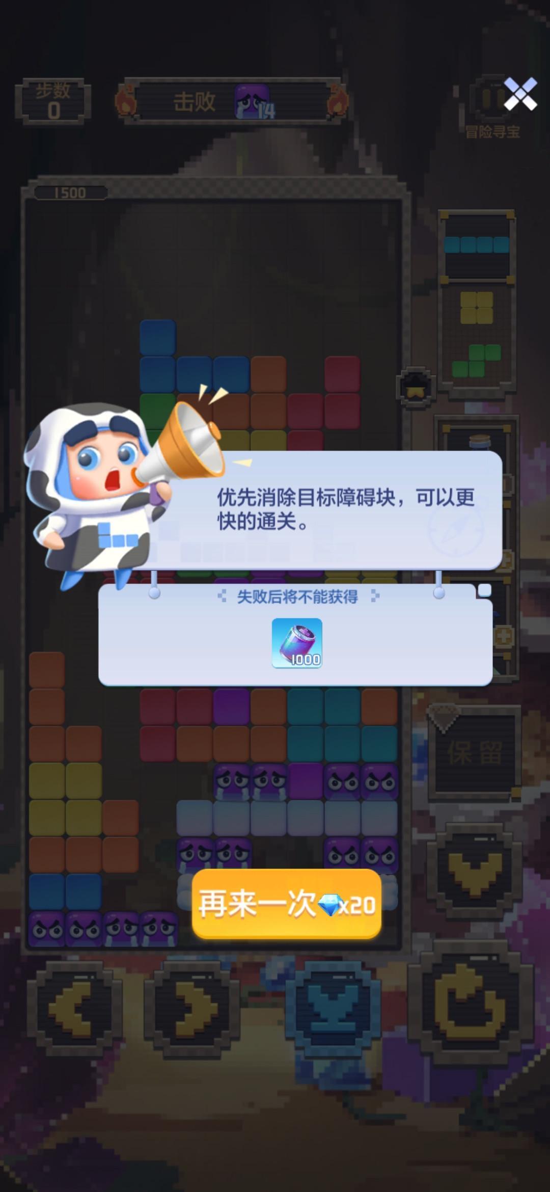 这里需要特别注意的是,一次冒险中最多可以获得7个宝箱,但是如果在关卡中挑战失败的话,就会失去所有宝箱。而在关卡中挑战失败的话,无法直接重新开启挑战,需要消耗钻石来增加步数。这里建议大家选择是否增加步数,主要看宝箱里的奖励,如果宝箱里面的奖励价值比较高,那么就选择消耗钻石来增加步数,反之就直接放弃。毕竟每隔一段时间后,就可以进行一次免费寻宝,暂时放弃也没有什么关系。